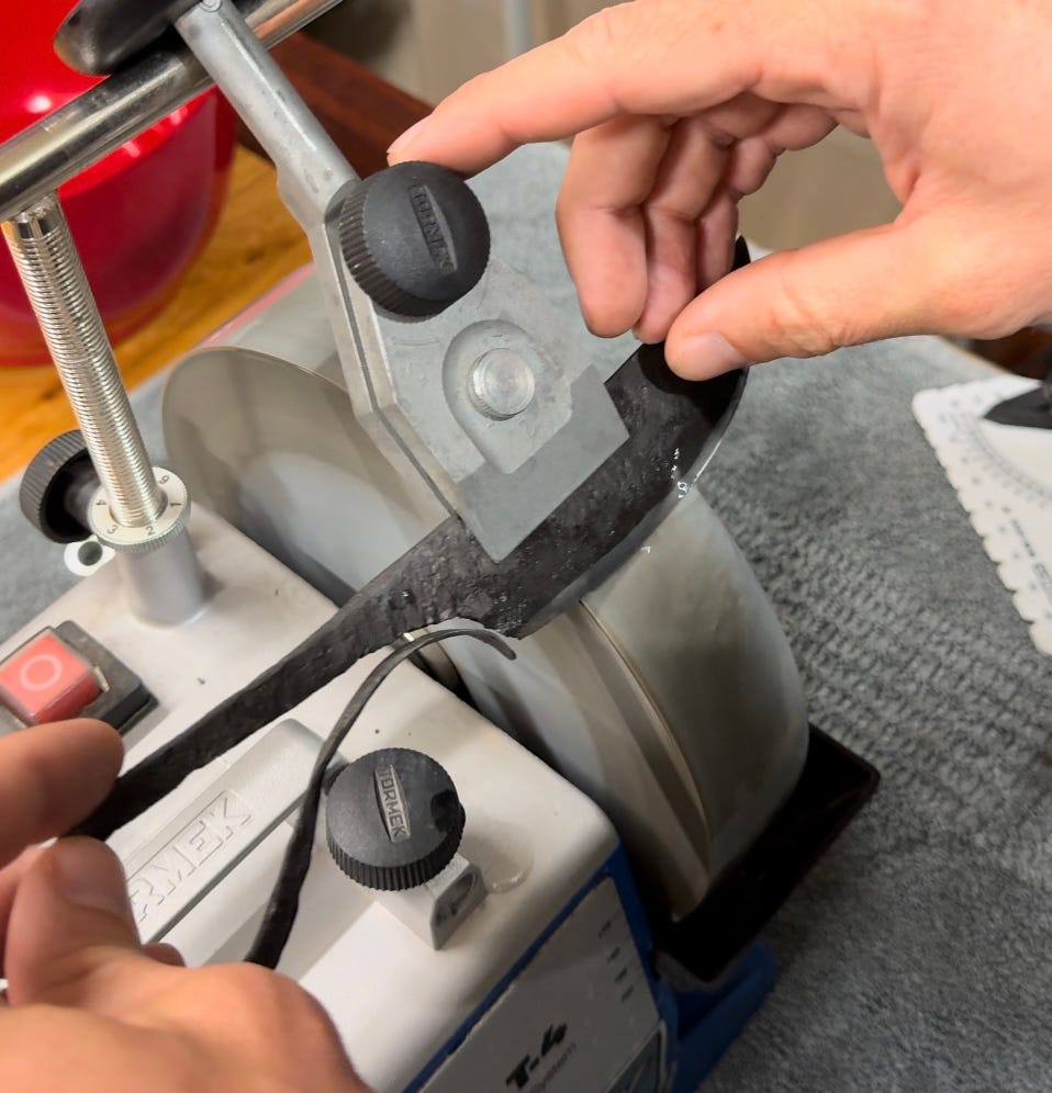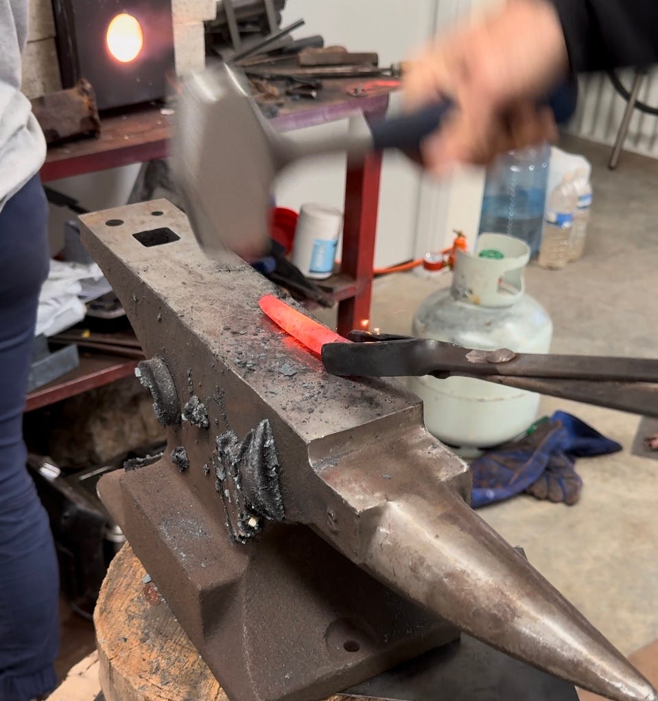 Jono taught me how to forge my very own blacksmith’s knife, which I’ll use in the outback. I started with a 3 inch piece of Toyota Hilux coil spring, hammered it into the shape that I wanted, then quenched it in cooking oil. The next day we tempered the steel and sharpened it on a whet wheel. It now easily slices through thin paper. Here is the steel right after the first few strikes, and the same steel as it was being sharpened the next day: